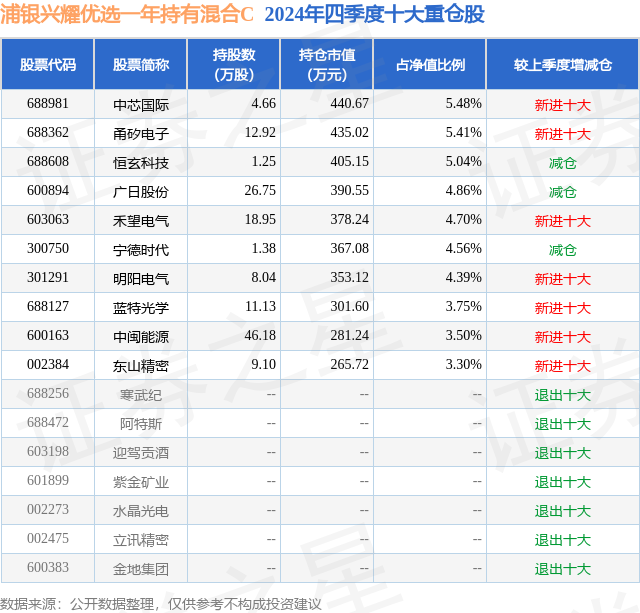 从基金规模来看,浦银兴耀优选一年持有混合C基金2024年四季度公布的基金规模为0.26亿元,较上一期规模2831.02万元变化了-267.97万元,环比变化了-9.47%。该基金最新一期资产配置为:股票占净值比79.42%,无债券类资产,现金占净值比20.87%。从基金持仓来看,该基金当季前十大股票仓位达44.99%,第一大重仓股为中芯国际(688981),持仓占比为5.48%。