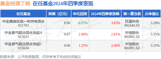 中金景气驱动混合发起A现任基金经理为丁杨。其中在任基金经理丁杨已从业4年又45天,2022年5月5日正式接手管理中金景气驱动混合发起A,任职期间累计回报为6.41%。目前还管理着3只基金产品(包括A类和C类),其中本季度表现最佳的基金为中金鑫瑞优选一年持有混合(011703),季度净值涨幅为3.83%。