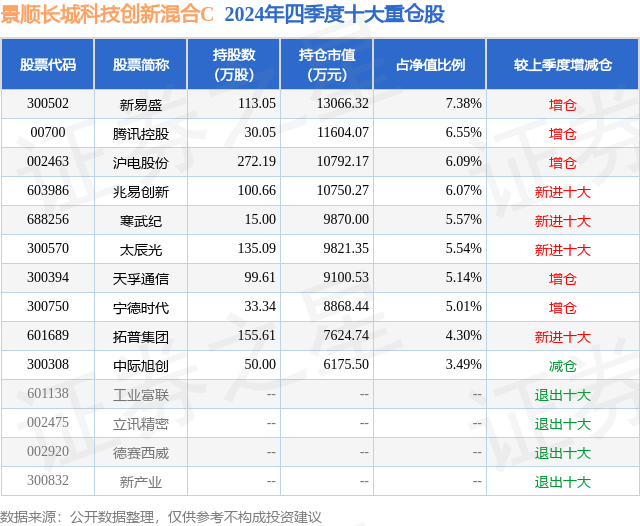 从基金规模来看,景顺长城科技创新混合C基金2024年四季度公布的基金规模为2.61亿元,较上一期规模1.06亿元变化了1.55亿元,环比变化了146.98%。该基金最新一期资产配置为:股票占净值比87.42%,无债券类资产,现金占净值比16.29%。从基金持仓来看,该基金当季前十大股票仓位达55.14%,第一大重仓股为新易盛(300502),持仓占比为7.38%。
