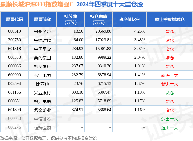 从基金规模来看,景顺长城沪深300指数增强C基金2024年四季度公布的基金规模为5.29亿元,较上一期规模3.42亿元变化了1.87亿元,环比变化了54.89%。该基金最新一期资产配置为:股票占净值比93.47%,债券占净值比2.69%,现金占净值比4.44%。从基金持仓来看,该基金当季前十大股票仓位达21.03%,第一大重仓股为贵州茅台(600519),持仓占比为4.23%。