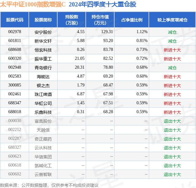 从基金规模来看,太平中证1000指数增强C基金2024年四季度公布的基金规模为0.3亿元,较上一期规模5779.41万元变化了-2758.72万元,环比变化了-47.73%。该基金最新一期资产配置为:股票占净值比94.09%,无债券类资产,现金占净值比10.42%。从基金持仓来看,该基金当季前十大股票仓位达7.02%,第一大重仓股为安宁股份(002978),持仓占比为1.12%。