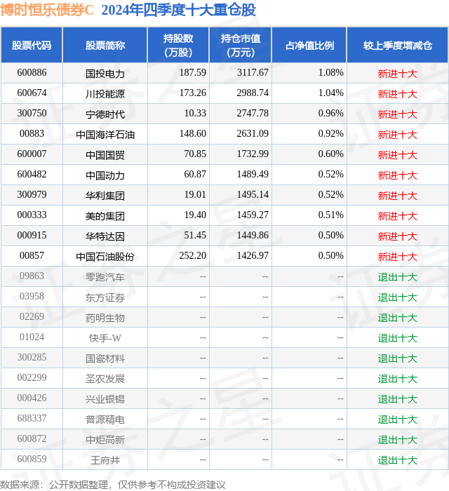 从基金规模来看,博时恒乐债券C基金2024年四季度公布的基金规模为9.55亿元,较上一期规模4625.18万元变化了9.09亿元,环比变化了1965.29%。该基金最新一期资产配置为:股票占净值比11.01%,债券占净值比85.67%,现金占净值比6.3%。从基金持仓来看,该基金当季前十大股票仓位达7.15%,第一大重仓股为国投电力(600886),持仓占比为1.08%。