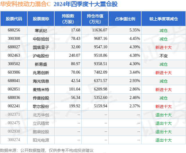 从基金规模来看,华安科技动力混合C基金2024年四季度公布的基金规模为1.03亿元,较上一期规模2.81亿元变化了-1.78亿元,环比变化了-63.27%。该基金最新一期资产配置为:股票占净值比84.4%,债券占净值比0.31%,现金占净值比15.51%。从基金持仓来看,该基金当季前十大股票仓位达36.93%,第一大重仓股为寒武纪(688256),持仓占比为5.35%。