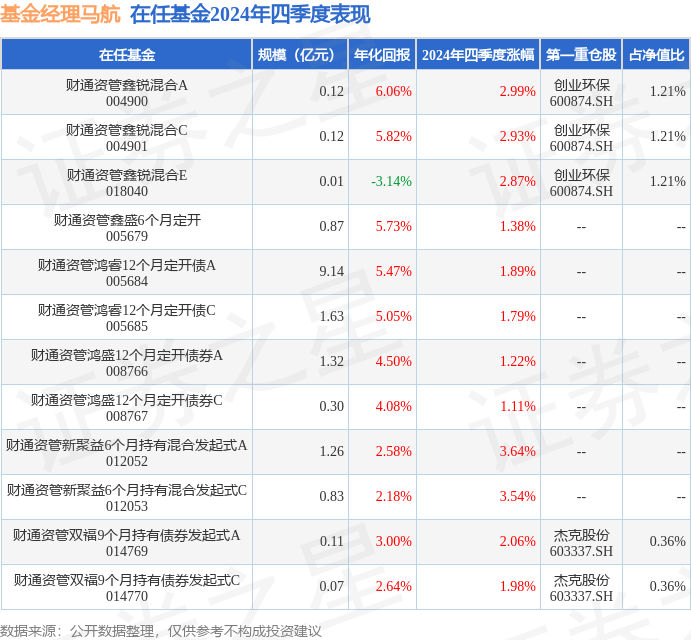 财通资管双福9个月持有债券发起式C现任基金经理为马航。其中在任基金经理马航已从业2年又86天,2022年10月31日正式接手管理财通资管双福9个月持有债券发起式C,任职期间累计回报为6.15%。目前还管理着12只基金产品(包括A类和C类),其中本季度表现最佳的基金为财通资管新聚益6个月持有混合发起式A(012052),季度净值涨幅为3.64%。