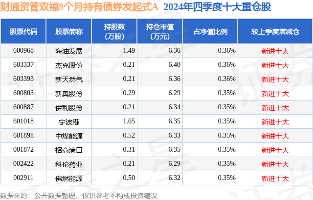 从基金规模来看,财通资管双福9个月持有债券发起式A基金2024年四季度公布的基金规模为0.11亿元,较上一期规模1120.86万元变化了8.7万元,环比变化了0.78%。该基金最新一期资产配置为:股票占净值比8.74%,债券占净值比89.23%,现金占净值比18.42%。从基金持仓来看,该基金当季前十大股票仓位达3.53%,第一大重仓股为海油发展(600968),持仓占比为0.36%。