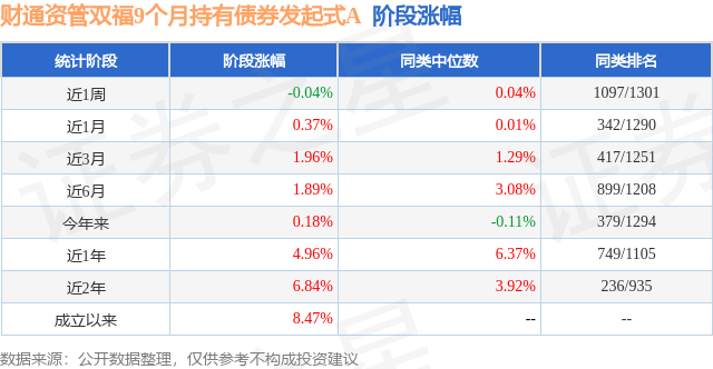 从业绩表现来看,财通资管双福9个月持有债券发起式A基金过去一年净值涨幅为4.96%,在同类基金中排名749/1105,同类基金过去一年净值涨幅中位数为6.37%。而基金过去一年的最大回撤为-1.67%,成立以来的最大回撤为-1.67%。
