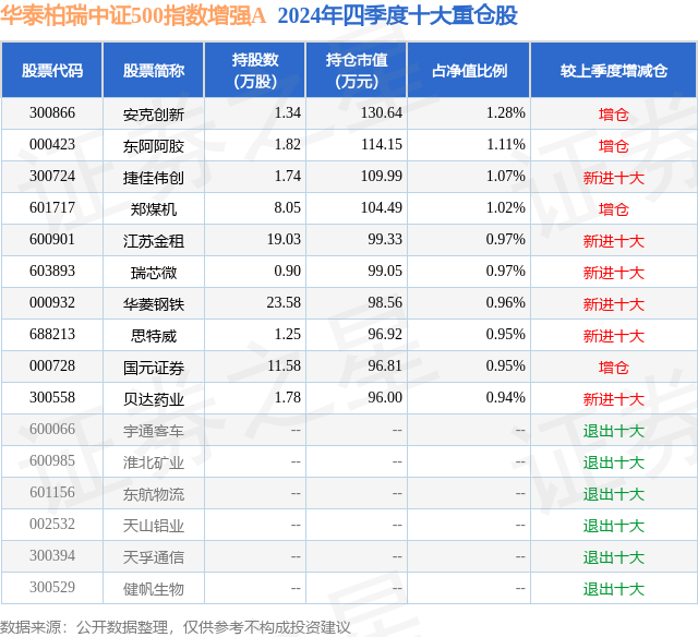 证券之星消息,日前华泰柏瑞中证500指数增强A基金公布四季报,2024年四季度最新规模0.79亿元,季度净值涨幅为-2.16%。
