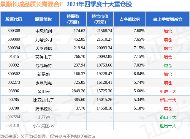 从基金规模来看,景顺长城品质长青混合C基金2024年四季度公布的基金规模为12.13亿元,较上一期规模2.04亿元变化了10.08亿元,环比变化了492.98%。该基金最新一期资产配置为:股票占净值比88.59%,无债券类资产,现金占净值比17.49%。从基金持仓来看,该基金当季前十大股票仓位达65.36%,第一大重仓股为中际旭创(300308),持仓占比为7.68%。