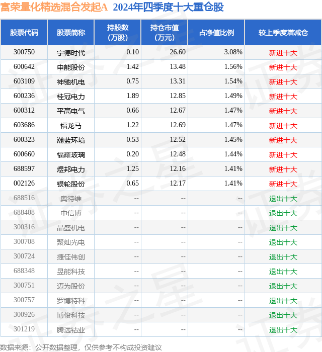 证券之星消息,日前富荣量化精选混合发起A基金公布四季报,2024年四季度最新规模0.08亿元,季度净值涨幅为5.85%。