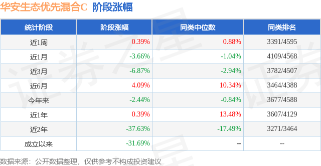 从业绩表现来看,华安生态优先混合C基金过去一年净值涨幅为0.39%,在同类基金中排名3607/4129,同类基金过去一年净值涨幅中位数为13.48%。而基金过去一年的最大回撤为-21.42%,成立以来的最大回撤为-48.25%。