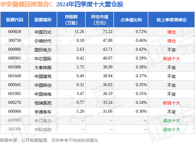 从基金规模来看,华安稳健回报混合C基金2024年四季度公布的基金规模为0.0亿元,较上一期规模28.34万元变化了7.21万元,环比变化了25.45%。该基金最新一期资产配置为:股票占净值比16.83%,债券占净值比82.57%,现金占净值比0.75%。从基金持仓来看,该基金当季前十大股票仓位达4.08%,第一大重仓股为中国石化(600028),持仓占比为0.72%。