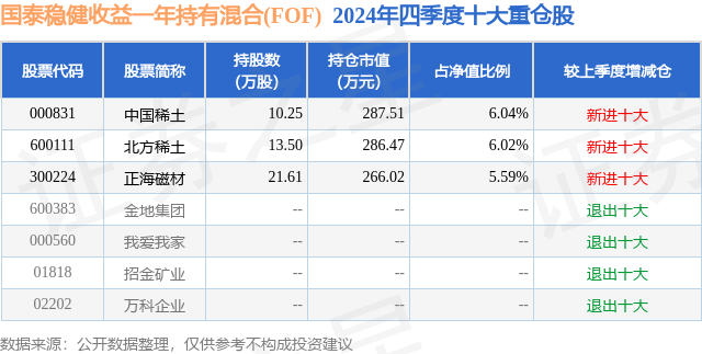 从基金规模来看,国泰稳健收益一年持有混合(FOF)基金2024年四季度公布的基金规模为0.48亿元,较上一期规模7804.74万元变化了-3047.28万元,环比变化了-39.04%。该基金最新一期资产配置为:股票占净值比17.66%,债券占净值比6.39%,现金占净值比1.72%。从基金持仓来看,该基金当季前十大股票仓位达17.65%,第一大重仓股为中国稀土(000831),持仓占比为6.04%。
