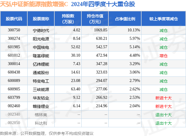 证券之星消息,日前天弘中证新能源指数增强C基金公布四季报,2024年四季度最新规模0.55亿元,季度净值涨幅为-5.46%。