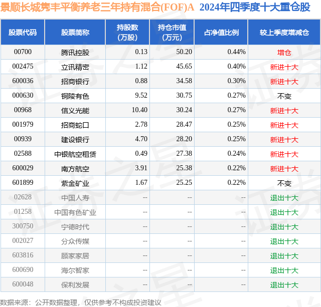 从基金规模来看,景顺长城隽丰平衡养老三年持有混合(FOF)A基金2024年四季度公布的基金规模为1.12亿元,较上一期规模1.13亿元变化了-94.2万元,环比变化了-0.84%。该基金最新一期资产配置为:股票占净值比5.32%,债券占净值比4.89%,现金占净值比4.23%。从基金持仓来看,该基金当季前十大股票仓位达2.86%,第一大重仓股为腾讯控股(00700),持仓占比为0.44%。