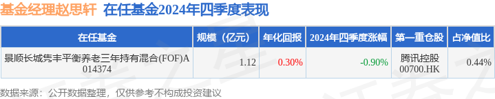 证券之星消息,日前景顺长城隽丰平衡养老三年持有混合(FOF)A基金公布四季报,2024年四季度最新规模1.12亿元,季度净值涨幅为-0.9%。