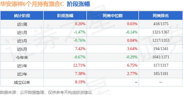从业绩表现来看,华安添祥6个月持有混合C基金过去一年净值涨幅为12.71%,在同类基金中排名117/1317,同类基金过去一年净值涨幅中位数为6.75%。而基金过去一年的最大回撤为-6.84%,成立以来的最大回撤为-10.66%。