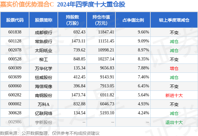 从基金规模来看,嘉实价值优势混合C基金2024年四季度公布的基金规模为0.07亿元,较上一期规模969.13万元变化了-250.44万元,环比变化了-25.84%。该基金最新一期资产配置为:股票占净值比91.69%,无债券类资产,现金占净值比9.15%。从基金持仓来看,该基金当季前十大股票仓位达72.67%,第一大重仓股为成都银行(601838),持仓占比为9.66%。