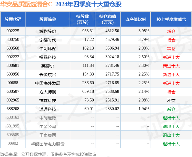 从基金规模来看,华安品质甄选混合C基金2024年四季度公布的基金规模为2.82亿元,较上一期规模2.37亿元变化了4407.66万元,环比变化了18.56%。该基金最新一期资产配置为:股票占净值比85.4%,无债券类资产,现金占净值比13.52%。从基金持仓来看,该基金当季前十大股票仓位达26.13%,第一大重仓股为濮耐股份(002225),持仓占比为3.98%。