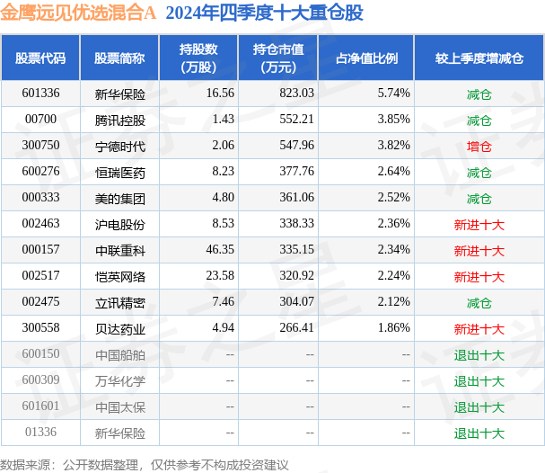 从基金规模来看,金鹰远见优选混合A基金2024年四季度公布的基金规模为1.04亿元,较上一期规模1.13亿元变化了-886.71万元,环比变化了-7.83%。该基金最新一期资产配置为:股票占净值比93.52%,债券占净值比4.7%,现金占净值比3.8%。从基金持仓来看,该基金当季前十大股票仓位达29.49%,第一大重仓股为新华保险(601336),持仓占比为5.74%。