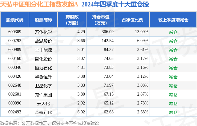从基金规模来看,天弘中证细分化工指数发起A基金2024年四季度公布的基金规模为0.06亿元,较上一期规模671.75万元变化了-36.25万元,环比变化了-5.4%。该基金最新一期资产配置为:股票占净值比94.86%,无债券类资产,现金占净值比5.88%。从基金持仓来看,该基金当季前十大股票仓位达43.65%,第一大重仓股为万华化学(600309),持仓占比为13.09%。