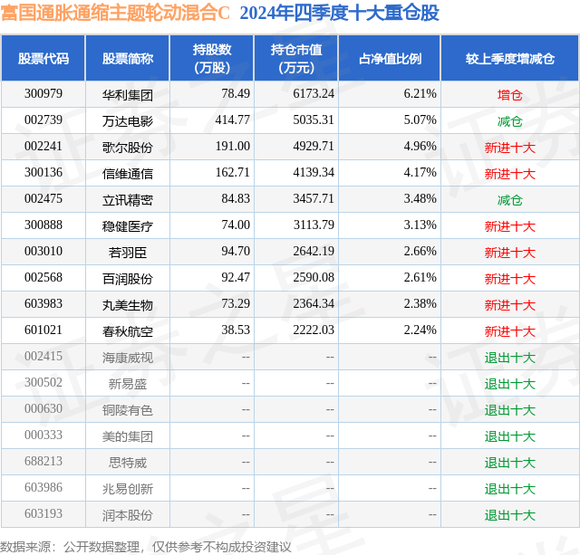从基金规模来看,富国通胀通缩主题轮动混合C基金2024年四季度公布的基金规模为2.91亿元,较上一期规模9.13亿元变化了-6.22亿元,环比变化了-68.17%。该基金最新一期资产配置为:股票占净值比63.1%,无债券类资产,现金占净值比40.11%。从基金持仓来看,该基金当季前十大股票仓位达36.91%,第一大重仓股为华利集团(300979),持仓占比为6.21%。