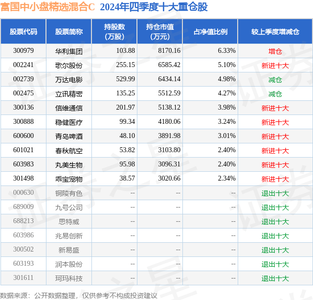 从基金规模来看,富国中小盘精选混合C基金2024年四季度公布的基金规模为2.78亿元,较上一期规模9.36亿元变化了-6.58亿元,环比变化了-70.31%。该基金最新一期资产配置为:股票占净值比65.82%,无债券类资产,现金占净值比37.43%。从基金持仓来看,该基金当季前十大股票仓位达38.05%,第一大重仓股为华利集团(300979),持仓占比为6.33%。