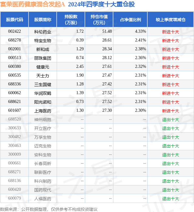 证券之星消息,日前富荣医药健康混合发起A基金公布四季报,2024年四季度最新规模0.11亿元,季度净值涨幅为-10.24%。