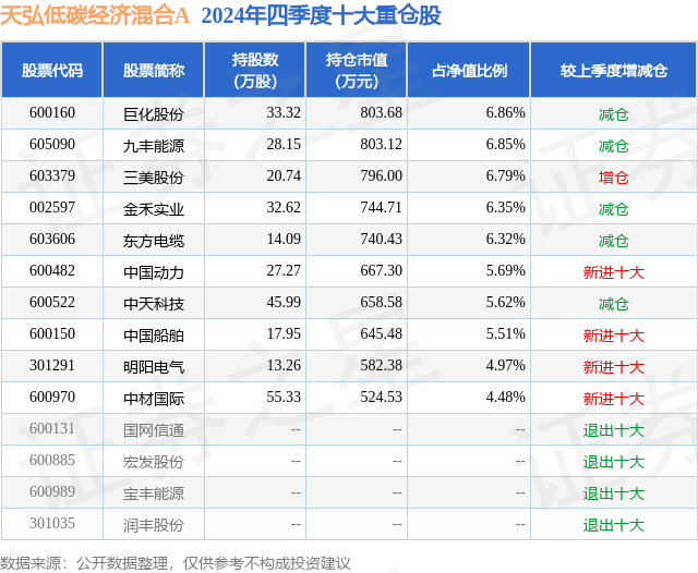 从基金规模来看,天弘低碳经济混合A基金2024年四季度公布的基金规模为0.65亿元,较上一期规模6884.87万元变化了-339.86万元,环比变化了-4.94%。该基金最新一期资产配置为:股票占净值比90.98%,无债券类资产,现金占净值比9.32%。从基金持仓来看,该基金当季前十大股票仓位达59.44%,第一大重仓股为巨化股份(600160),持仓占比为6.86%。