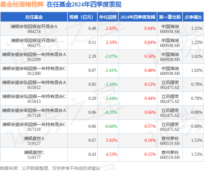 证券之星消息,日前浦银安盛安弘回报一年持有混合C基金公布四季报,2024年四季度最新规模0.2亿元,季度净值涨幅为0.44%。
