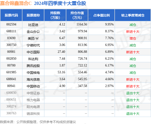 从基金规模来看,嘉合锦鑫混合C基金2024年四季度公布的基金规模为0.58亿元,较上一期规模7809.78万元变化了-2023.24万元,环比变化了-25.91%。该基金最新一期资产配置为:股票占净值比91.53%,无债券类资产,现金占净值比0.1%。从基金持仓来看,该基金当季前十大股票仓位达64.67%,第一大重仓股为比亚迪(002594),持仓占比为9.95%。