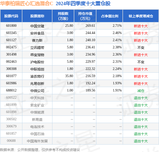 从基金规模来看,华泰柏瑞匠心汇选混合C基金2024年四季度公布的基金规模为0.08亿元,较上一期规模923.17万元变化了-111.43万元,环比变化了-12.07%。该基金最新一期资产配置为:股票占净值比79.32%,无债券类资产,现金占净值比21.09%。从基金持仓来看,该基金当季前十大股票仓位达22.89%,第一大重仓股为中国交建(601800),持仓占比为2.71%。