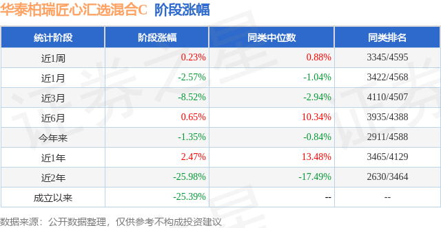 从业绩表现来看,华泰柏瑞匠心汇选混合C基金过去一年净值涨幅为2.47%,在同类基金中排名3465/4129,同类基金过去一年净值涨幅中位数为13.48%。而基金过去一年的最大回撤为-17.67%,成立以来的最大回撤为-35.76%。