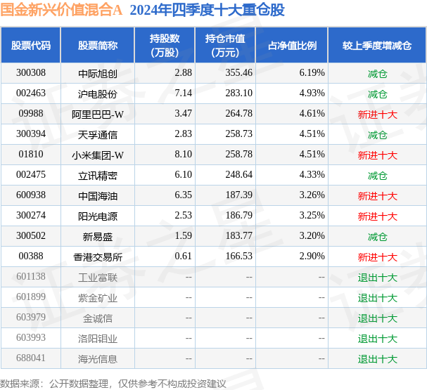 从基金规模来看,国金新兴价值混合A基金2024年四季度公布的基金规模为0.34亿元,较上一期规模3665.35万元变化了-273.71万元,环比变化了-7.47%。该基金最新一期资产配置为:股票占净值比64.72%,无债券类资产,现金占净值比35.54%。从基金持仓来看,该基金当季前十大股票仓位达41.69%,第一大重仓股为中际旭创(300308),持仓占比为6.19%。