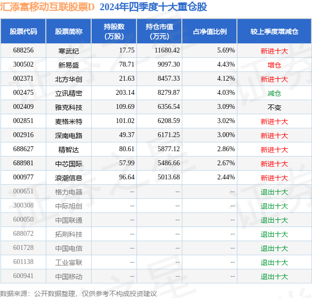 证券之星消息,日前汇添富移动互联股票D基金公布四季报,2024年四季度最新规模0.2亿元,季度净值涨幅为3.03%。