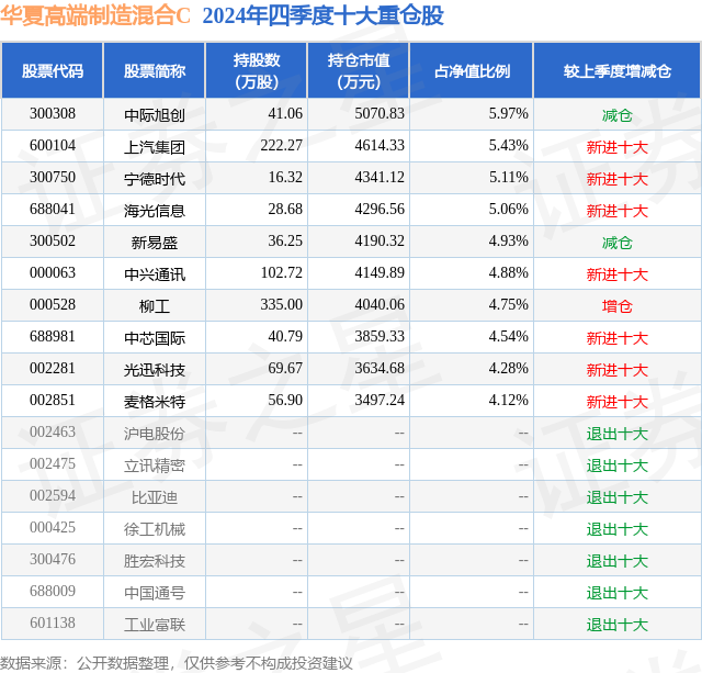 从基金规模来看,华夏高端制造混合C基金2024年四季度公布的基金规模为0.23亿元,较上一期规模2335.19万元变化了9.5万元,环比变化了0.41%。该基金最新一期资产配置为:股票占净值比92.35%,无债券类资产,现金占净值比12.67%。从基金持仓来看,该基金当季前十大股票仓位达49.07%,第一大重仓股为中际旭创(300308),持仓占比为5.97%。