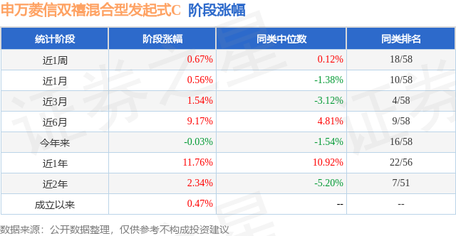 从业绩表现来看,申万菱信双禧混合型发起式C基金过去一年净值涨幅为11.76%,在同类基金中排名22/56,同类基金过去一年净值涨幅中位数为10.92%。而基金过去一年的最大回撤为-7.66%,成立以来的最大回撤为-12.27%。