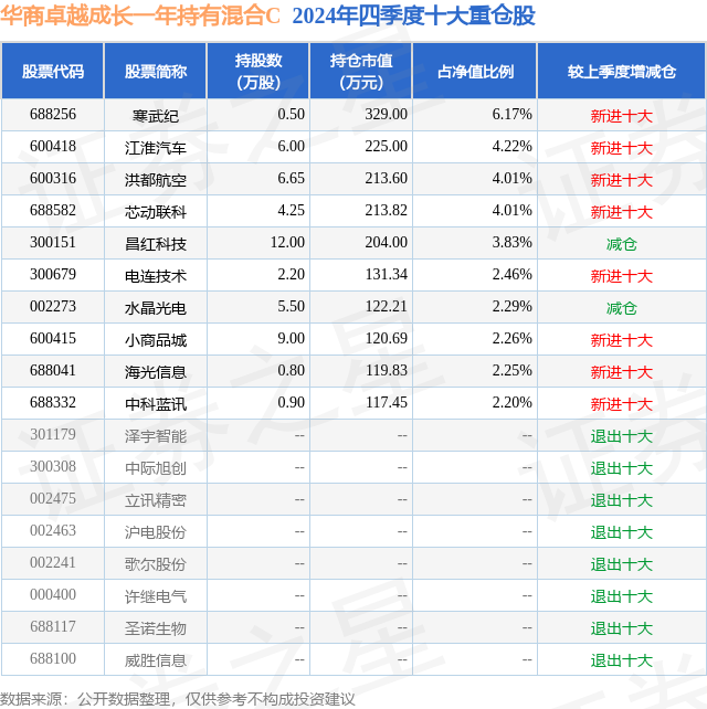 证券之星消息,日前华商卓越成长一年持有混合C基金公布四季报,2024年四季度最新规模0.01亿元,季度净值涨幅为-2.96%。