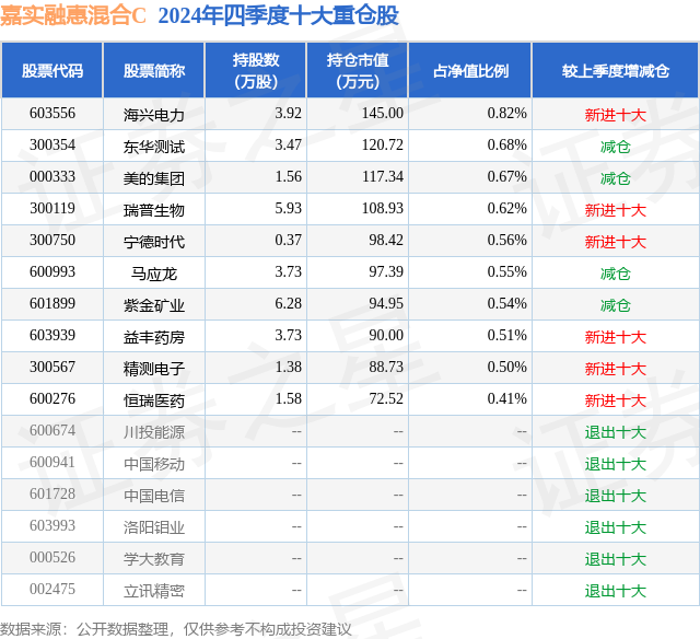 证券之星消息,日前嘉实融惠混合C基金公布四季报,2024年四季度最新规模0.13亿元,季度净值涨幅为0.6%。