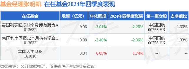 从基金规模来看,富国利享回报12个月持有混合C基金2024年四季度公布的基金规模为0.08亿元,较上一期规模899.27万元变化了-99.0万元,环比变化了-11.01%。该基金最新一期资产配置为:股票占净值比19.41%,债券占净值比74.91%,现金占净值比6.04%。从基金持仓来看,该基金当季前十大股票仓位达8.42%,第一大重仓股为中国国航(00753),持仓占比为1.33%。