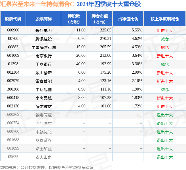 从基金规模来看,汇泉兴至未来一年持有混合C基金2024年四季度公布的基金规模为0.1亿元,较上一期规模1165.93万元变化了-140.49万元,环比变化了-12.05%。该基金最新一期资产配置为:股票占净值比68.01%,无债券类资产,现金占净值比38.66%。从基金持仓来看,该基金当季前十大股票仓位达32.18%,第一大重仓股为长江电力(600900),持仓占比为5.55%。