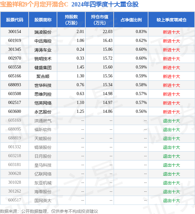 从基金规模来看,宝盈祥和9个月定开混合C基金2024年四季度公布的基金规模为0.05亿元,较上一期规模506.5万元变化了17.06万元,环比变化了3.37%。该基金最新一期资产配置为:股票占净值比16.78%,债券占净值比80.49%,现金占净值比3.21%。从基金持仓来看,该基金当季前十大股票仓位达6.11%,第一大重仓股为瑞凌股份(300154),持仓占比为0.83%。