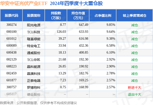 从基金规模来看,华安中证光伏产业ETF基金2024年四季度公布的基金规模为0.66亿元,较上一期规模8886.66万元变化了-2311.94万元,环比变化了-26.02%。该基金最新一期资产配置为:股票占净值比98.24%,无债券类资产,现金占净值比2.03%。从基金持仓来看,该基金当季前十大股票仓位达55.29%,第一大重仓股为阳光电源(300274),持仓占比为9.85%。