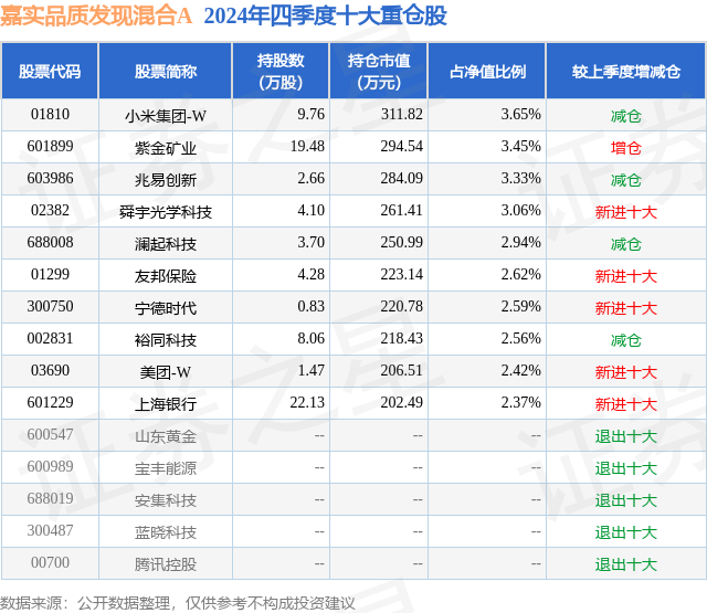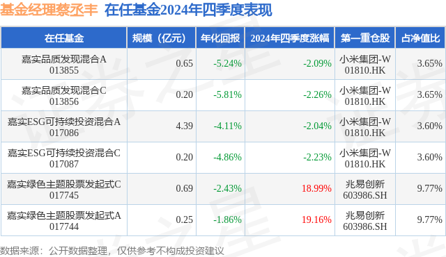 从基金规模来看,嘉实品质发现混合A基金2024年四季度公布的基金规模为0.65亿元,较上一期规模7197.97万元变化了-693.03万元,环比变化了-9.63%。该基金最新一期资产配置为:股票占净值比90.27%,债券占净值比6.42%,现金占净值比4.45%。从基金持仓来看,该基金当季前十大股票仓位达28.99%,第一大重仓股为小米集团-W(01810),持仓占比为3.65%。