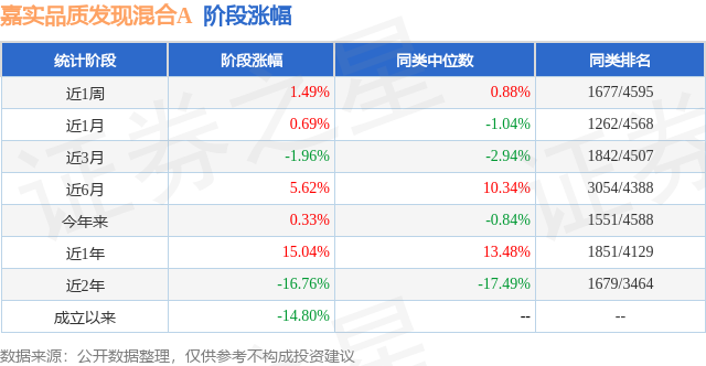 从业绩表现来看,嘉实品质发现混合A基金过去一年净值涨幅为15.04%,在同类基金中排名1851/4129,同类基金过去一年净值涨幅中位数为13.48%。而基金过去一年的最大回撤为-17.1%,成立以来的最大回撤为-39.7%。