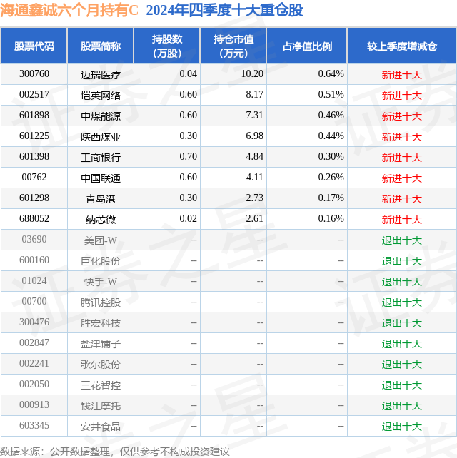 从基金规模来看,海通鑫诚六个月持有C基金2024年四季度公布的基金规模为0.07亿元,较上一期规模680.54万元变化了-0.17万元,环比变化了-0.03%。该基金最新一期资产配置为:股票占净值比2.95%,债券占净值比90.5%,现金占净值比14.56%。从基金持仓来看,该基金当季前十大股票仓位达2.94%,第一大重仓股为迈瑞医疗(300760),持仓占比为0.64%。