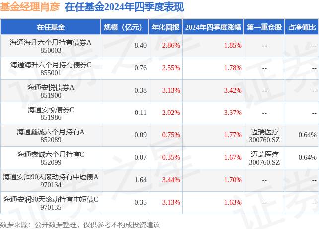 海通鑫诚六个月持有C现任基金经理为肖彦,本季度增聘基金经理肖彦,近期离任的基金经理为邱博文。其中在任基金经理肖彦已从业2年又349天,2024年12月27日正式接手管理海通鑫诚六个月持有C,任职期间累计回报为0.36%。目前还管理着8只基金产品(包括A类和C类),其中本季度表现最佳的基金为海通安悦债券A(851900),季度净值涨幅为3.42%。
