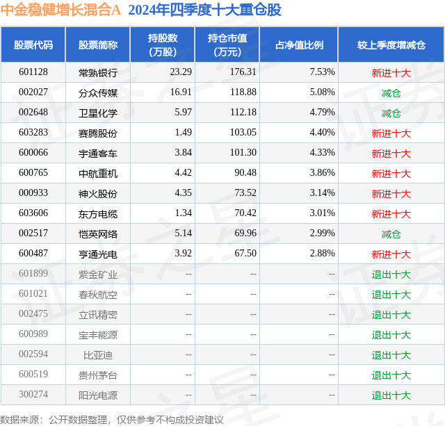 从基金规模来看,中金稳健增长混合A基金2024年四季度公布的基金规模为0.2亿元,较上一期规模2679.02万元变化了-710.02万元,环比变化了-26.5%。该基金最新一期资产配置为:股票占净值比72.66%,无债券类资产,现金占净值比11.98%。从基金持仓来看,该基金当季前十大股票仓位达42.01%,第一大重仓股为常熟银行(601128),持仓占比为7.53%。