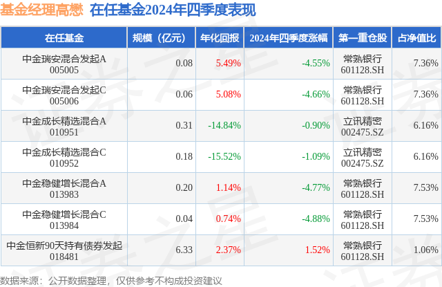 证券之星消息,日前中金稳健增长混合A基金公布四季报,2024年四季度最新规模0.2亿元,季度净值涨幅为-4.77%。