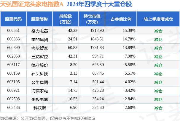 证券之星消息,日前天弘国证龙头家电指数A基金公布四季报,2024年四季度最新规模0.16亿元,季度净值涨幅为-6.73%。