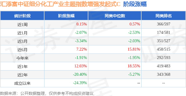 从业绩表现来看,汇添富中证细分化工产业主题指数增强发起式C基金过去一年净值涨幅为12.03%,在同类基金中排名419/483,同类基金过去一年净值涨幅中位数为18.55%。而基金过去一年的最大回撤为-19.95%,成立以来的最大回撤为-42.82%。
